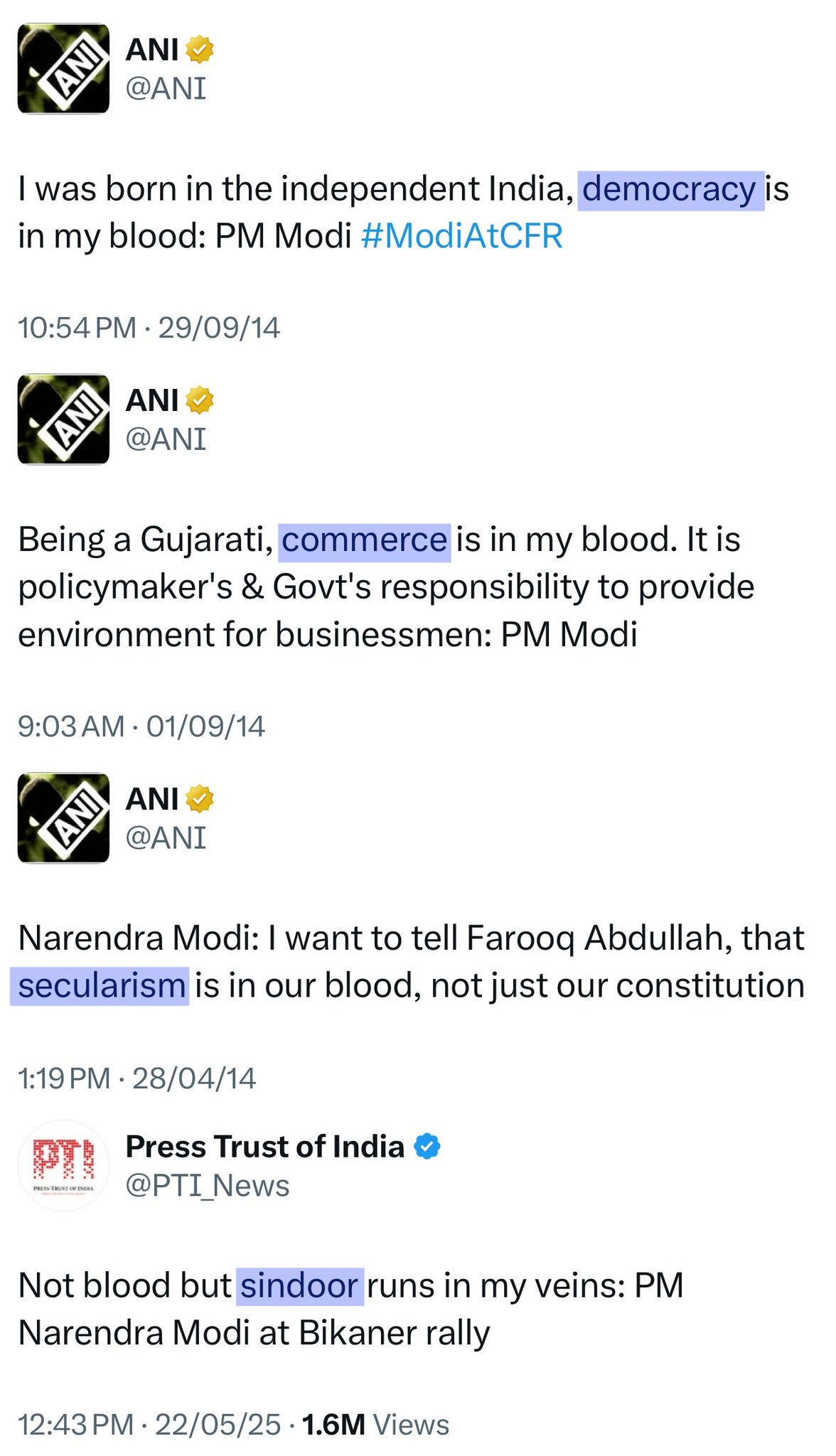 Meanwhile, nearly 1,000 km away and far removed from the frontline pain, in his first public address since ‘Operation Sindoor’ and the four-day long military conflict with Pakistan on Thursday, Prime Minister Narendra Modi addressed a rally on Thursday in Rajasthan’s Bikaner and said that “not blood, but hot sindoor (vermillion) is flowing in my veins”. [See also Reportedly].