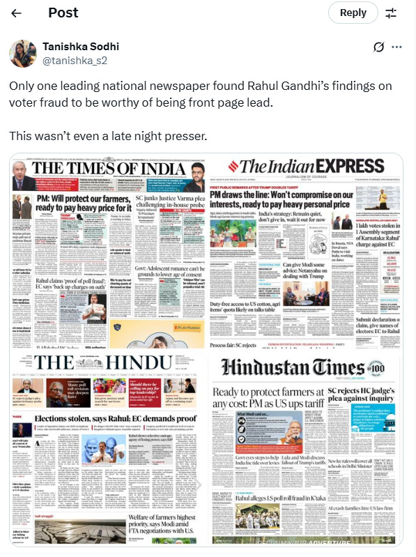Rahul Gandhi’s made strong allegations about vote theft, but the shockwave seems to have escaped the lead sections of many newspapers English and Hindi, Newslaundry points out.