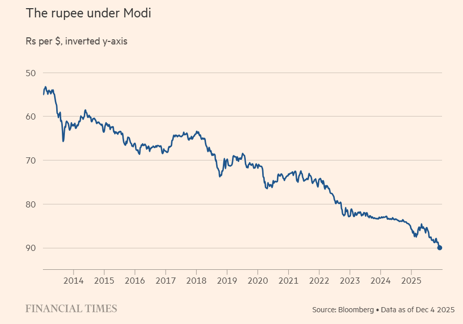 India’s currency has tumbled past the psychologically critical 90-per-dollar mark, plunging to an all-time low and showing no signs of stopping, rattling financial markets and amplifying concerns over the country’s fragile macroeconomic landscape. A fall of more than 5% has made the “the worst-performing Asian currency,” says the Financial Times. The newspaper notes that the primary reason — apart from the trade stalemate with the US, which continues to bite — “is the Indian stock market, which has underperformed other emerging markets by the widest margin since 1993. The MSCI India index’s dollar return this year was 2.5%, while the larger emerging markets index returned 27.7%. As a result, foreign portfolio investors have moved $16bn out of the country and into better performing markets.”