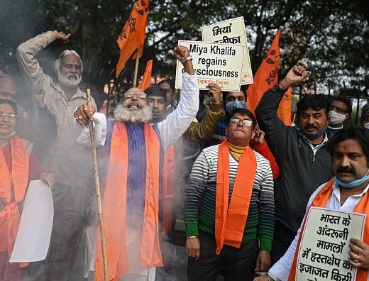 While the US State Department urged the Indian government to resolve its differences with the farmers over agriculture laws through dialogue, saying that peaceful protests and unhindered access to the internet are a “hallmark of any thriving democracy”, the Foreign Ministry chose to deflect attention by comparing the violence during the farmers’ tractor parade on January 26 with the storming of Capitol Hill. It also said, “The temporary measures with regard to internet access in certain parts of the NCR region were therefore understandably undertaken to prevent further violence.” It’s a measured counterpoint to the anger, sanctimonious outrage and coordinated tweets from assorted celebrities and ministers, which were on full display against Rihanna and other international celebrities when they questioned the internet ban at protest sites.